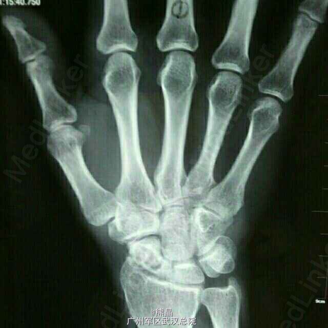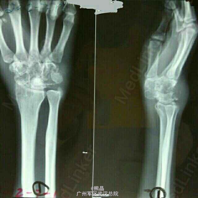 腕关节结核在上肢关节中居第三位。病灶多开始于骨骼,或同时累及滑膜,单纯为滑膜型者少见。 病理上干酪型多于肉芽型。多见于青少年,10岁以下较少发病,病灶较易侵犯腱鞘而影响手的功能。脓肿易穿破皮外形成窦道。 X线表现,早期单纯滑膜结核,可见骨质疏松和软组织肿胀。尺桡骨下端结核可有死骨中心型和溶骨性破坏的边缘型。晚期可见多个腕骨尺,桡下端和掌骨关节面广泛破坏。腕关节出现畸形。