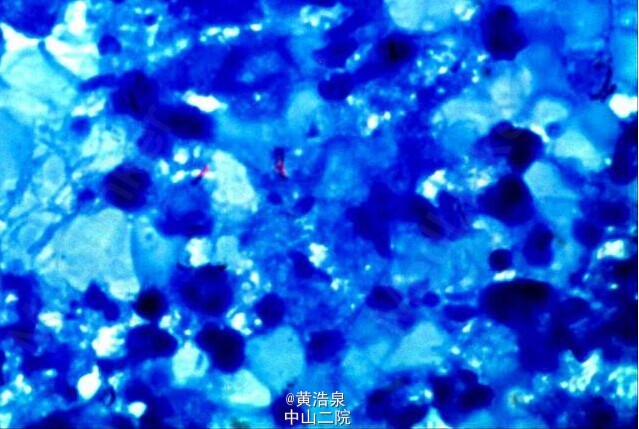患者,男性,47 岁,消化不良、上腹部不适 2 个月,伴有体重减轻约 4kg,无消化道出血,无发热、咳嗽。既往无疾病、手术史。体格检查无明显异常。实验室检查示:血红蛋白 114g/L,血沉增快 54mm/h,无 HIV、乙肝和丙肝病毒感染。心电图、胸片无异常。 胃镜示:胃体处可见多个粘膜下肿物 (SEL)(图 1A),贲门、胃窦粘膜正常。血中嗜铬粒蛋白 A 和尿液中 5 羟基吲哚乙酸水平正常。行超声内镜检查(图 1B) 并于引导下行肿物穿刺,穿刺吸取物送检细胞学样本如图 2。 超声内镜显示胃壁内固有肌层处,可见多个大小约 1.5-2cm 界限清楚的低回声区,中心呈现高回声,伴有固有肌层的破坏 (图 1B),无胃周脏器及纵膈淋巴结累及。 穿刺吸取物细胞学检查显示为肉芽肿病变 (图 2),ZiehlNeelsen 染色示与结核分枝杆菌形态学一致 (图 3),培养后证实与染色结果一致。 超声内镜引导下肿物穿刺并送检细胞学检查及培养最终确诊为胃结核。 (来源:丁香园)
