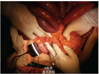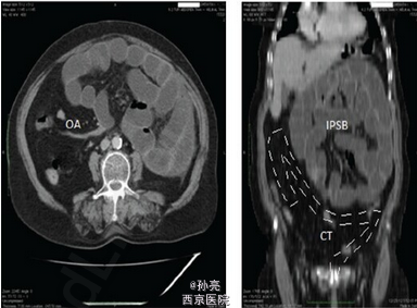 患者表现为腹痛腹胀、肛门停止排气排便、恶心呕吐 2 天。既往有高血压病史 10 年,慢性阻塞性肺部疾患 6 年,2 型糖尿病 4 年。无腹部手术史,无创伤、黄疸、直肠出血、体重减轻。体格检查表现为腹部膨隆、肠鸣音亢进、全腹压痛、腹肌软、无反跳痛。直肠指检发现壶腹部空虚。实验室检查为白细胞 12,500K/L,血糖 150mg/dL。影像学检查提示左侧小肠肠腔扩张,远端回肠和结肠塌陷(下图 1)。于是进行探查手术。术中发现扩张的空肠和回肠袢被腹膜囊包绕,位于胃和横结肠之间。末端回肠嵌顿进横结肠系膜正下方,且大约有 4cm 回肠嵌进盲肠,产生扭曲和梗阻。由于到该处解剖部位没有形成内疝的可能性,因此,该病例考虑为先天性腹内疝引发的肠梗阻。梗阻解除后,小肠被放置在腹腔内的正常位置(下图 2)。