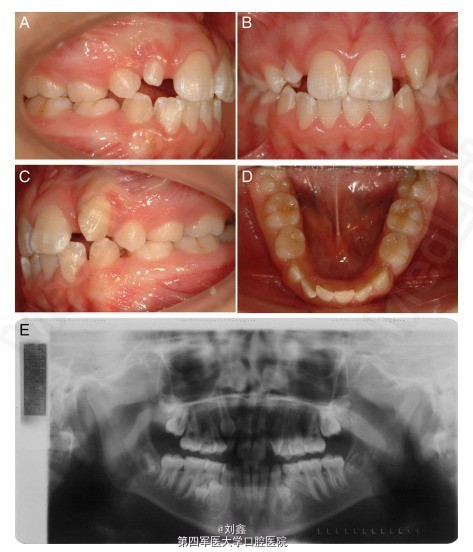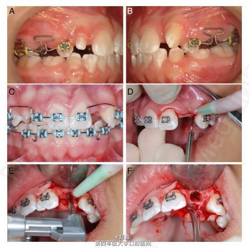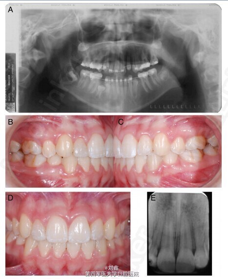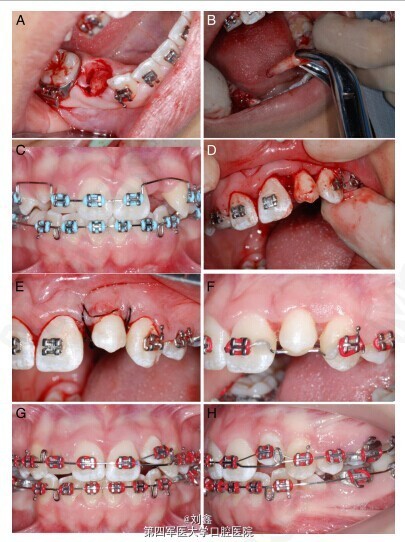 该患者为未成年女性,13 岁,因牙列不齐,影响美观要求正畸治疗。通过对患者的临床检查和曲面断层照片检查,发现患者上颌 15、22、25、35 牙齿尚未发育完全,12 牙齿发育过小;咬合关系和上下颌骨关系正常(图 1)。 根据患者的具体情况,制定详细的治疗计划。首先应用固定矫治器将 14 和 24 移向远中(图 2 A-D),13 随后萌出。21 和 23 之间的空间也被打开。依据 CT 三维影像确定移植位点牙齿的准确数据,考虑到 45 的大小、牙根的发育程度等情况,选择将 45 拔出后移植至 22 的位置。手术预备移植位点的牙槽窝 (图 2E,F)。 拔出 45,移植入预备好的 22 牙槽窝(图 3A-F)。缝合伤口,术后用树脂将 45 与邻牙固定两个月,四个月后开始移动 45(图 3G,H)。 该病例整个治疗过程持续 32 个月,治疗结束时临床和影像学检查显示,移植的前磨牙外形美观,牙根发育已完成,根管也已完全闭锁,预后良好(图 4A-E)。