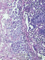 患者男性,20 岁,反复腹泻半年,加重 2周伴少量脓血。体检:肝、脾肋下未触及,全腹无压痛,无包块,无肌紧张,肠鸣音正常,双下肢不肿。实验室检查:大便常规 +OB:OB(±);大便培养+药敏:未培养出病菌;余均正常。B 超:肝、胆、脾、胰正常。病理标本来自肠镜活检组织,经 10% 中性福尔马林固定,常规脱水,石蜡包埋。4μm 厚切片,HE 染色,光镜观察。