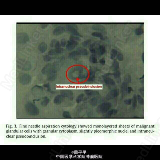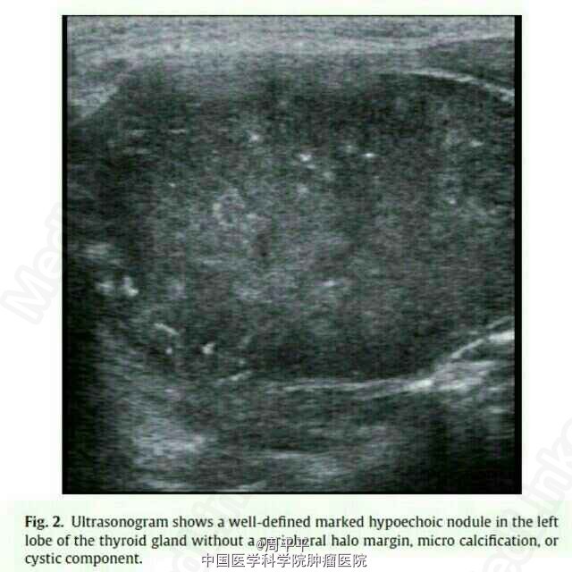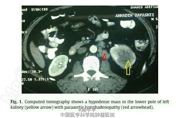 患者,男,58 岁,因左侧颈部肿块和颈部疼痛 3 月入院。患者无喘鸣,声音嘶哑或吞咽困难等伴随症状。患者于 1.5 年前因 T1bN2M0低分化肾细胞癌行左肾切除术(如图 1)。查体:发现甲状腺左叶有一 8cm×6cm 大小的硬性无痛性肿块,并颈前三角左侧有多个 1-3cm 的硬性肿块。过去四月,体重下降 30kg以上。患者甲状腺功能正常,所有实验室指标均在正常参考值范围内。细针穿刺细胞学检查报告为单层恶性甲状腺细胞,其含有颗粒状细胞质,多形核,细胞内假包囊和核,这表明其为转移性肾细胞癌。组织病例报告也证实了该诊断。