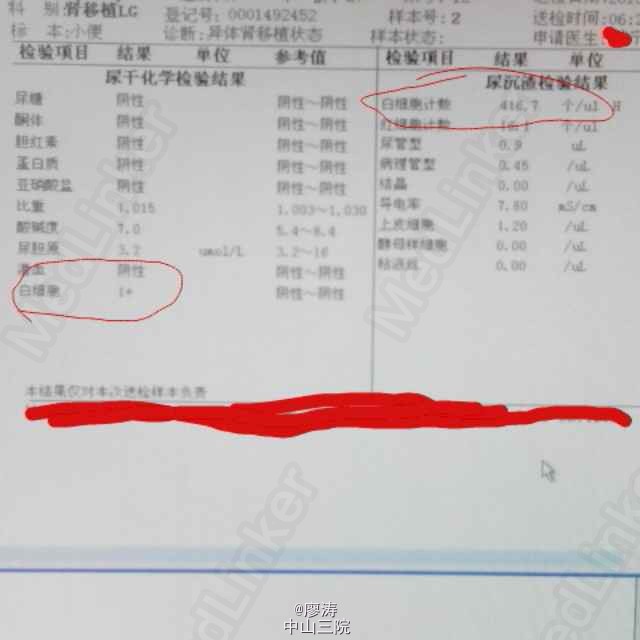 患者男,27岁,2014-12-1在我院行肾移植术,术后1月开始反复出现尿频尿急,自己服用拜复乐有明显好转,但是反复发作,于2015-1-25入院治疗。肾移植术后由于服用免疫抑制剂,感染非常常见,患者有不适应及时到医院专科就诊,患者自己用药常常疗程不足。另外,感染如果不及时处理,容易引发排斥反应。所以,肾移植术后定期随诊尤为重要。
