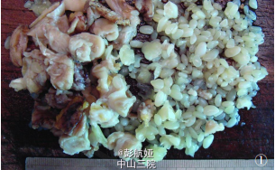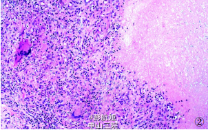 患者男性,39岁。2年前无明显诱因下出现左腕部及手掌红肿伴疼痛性小肿块,自行用针刺破肿块后有清亮或脓性液体流出。遂在当地医院行手术治疗,后肿块再次长大,并伴有左手指麻木,于2011年 员 月到我院就诊。病程中患者无发热、盗汗。专科检查:左手腕部内侧可见鸡蛋大小肿块,背侧见一4cm*2cm*2cm大小条索状肿块,肿块均有压痛及波动感。皮肤表面可见一长约 5cm 的陈旧性手术瘢痕,无红肿及皮肤破溃。否认有结核、肝炎等传染病史,否认有家族遗传病史。术中所见:左腕关节滑囊囊壁与周围组织及肌腱黏连严重,部分肌腱已被侵蚀,囊内含有大量灰白色米粒样物和黄色浑浊液体,部分区域见白色豆渣样物。切除囊壁和清理囊内组织后送病理检查。