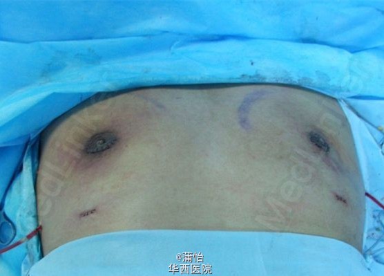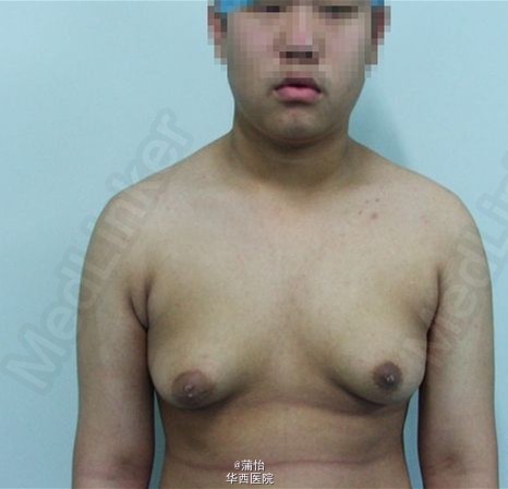 男孩十五岁,乳房逐渐增大三年,垂体CT,肾上腺CT,血液激素水平检测正常。乳腺彩超显示乳腺增生。采取吸脂结合乳晕下切口腺体切除术矫正治疗,术后放置负压引流,加压包扎。