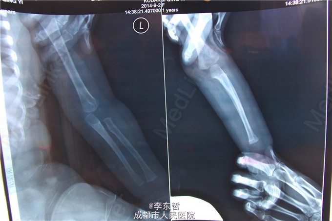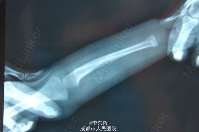 患儿1岁, 在练习走路过程中不慎摔倒, 左手撑地. 回家发现爬行困难, 左手不敢着地. 来院拍X光后, 确定为左桡骨青枝骨折.