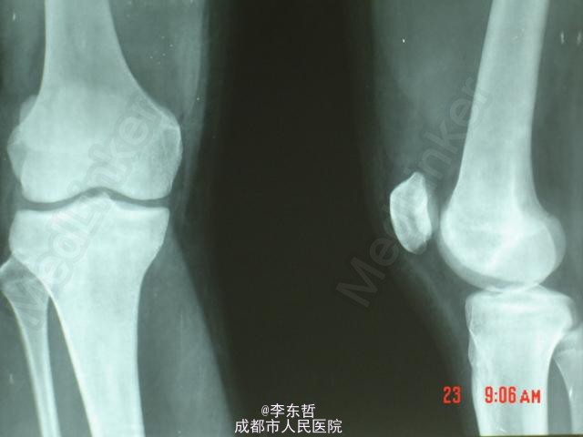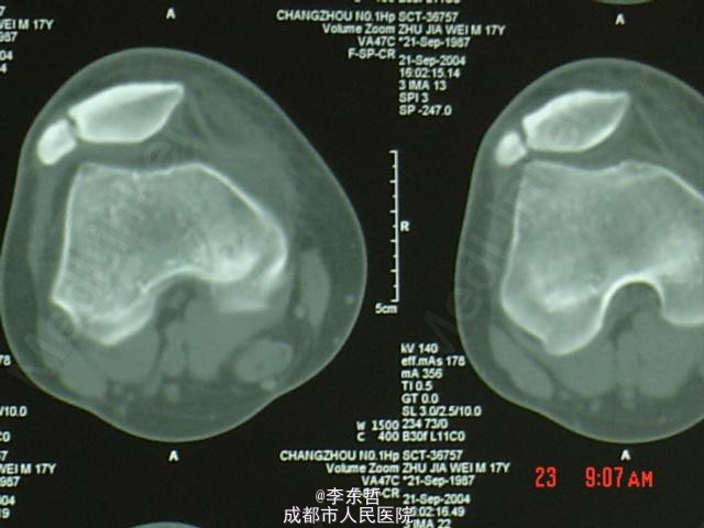 患者男,17岁,车祸致伤右膝,肿胀疼痛,能下地行走,考虑但病人年龄小,骨折愈合快,给予患肢功能位固定6周。
