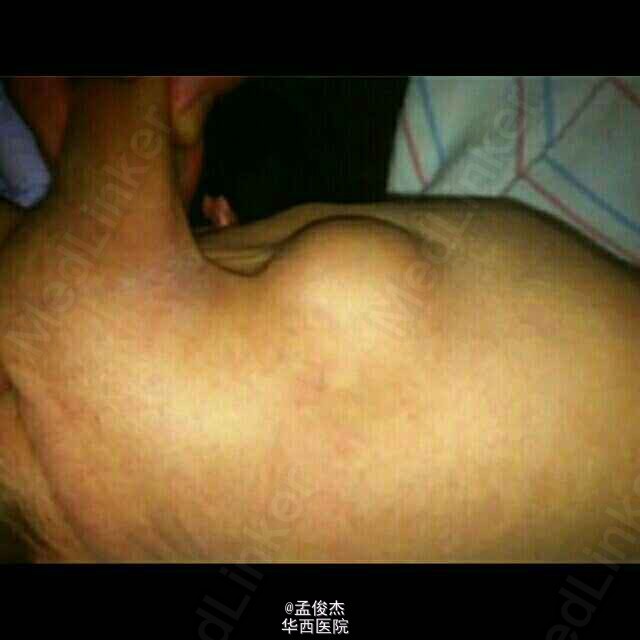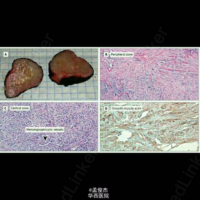 患儿出生即发现胸部有一肿块。母亲35岁,孕38.3周,顺产,G3P2,无病史。孕期实验室检查不明,产检规律,超声检查无明显异常。患儿阿普加评分,第一分钟9,第5分钟9,未进行复苏。体检示右侧躯干T4-T6平面有以3.5*4cm大小的圆形肿块,质硬,粗糙,不均匀,皮肤未见褪色,其余检查未见异常。超声检查示肿块大小3.9*1.8*3.5cm大小,分叶,边缘清晰未见其他结构破坏。肿块切除后患者出院。2个月后在左胸壁处再次出现损害。患儿4个月大时切除,术中发现右侧胸壁有3*3cm大小的肿块与胸膜相连,左胸壁皮下有1*1 cm大小的肿块。病理结果示:平滑肌actin蛋白阳性,结蛋白,肌球蛋白,s-100阴性。诊断为婴儿肌纤维瘤病。 婴儿肌纤维瘤病是一种婴儿期最常见良性纤维瘤,可以发生在任何有间皮组织的地方,比如脾,肝脏,软组织。组织病理显示有卵圆形到梭形核的成纤维细胞排列成交织束状或漩涡状。如果仅皮肤及骨骼发生纤维瘤则预后良好,如无并发症可望在1~2岁时纤维瘤自然消退。 纤维瘤如造成广泛性损害,死亡率高,存活超过4个月者损害可自然消退。