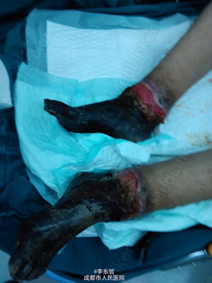 患者藏族男性,13岁,野外迷路致双下肢冻伤,相继出现双下肢干性坏疽,拟行截肢术。