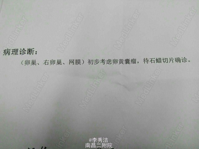 患者,女,10岁,因“反复右下腹痛4天,发现盆腔包块4天”入院,彩超检查示幼稚子宫,右侧盆腔10*10*9cm肿物,择日腹腔镜手术,术中见右侧卵巢肿瘤大小约10*10*9cm肿物,表面见一长约3cm破裂口,囊内液黄色烂肉状。术中冰冻切片示卵巢囊瘤。