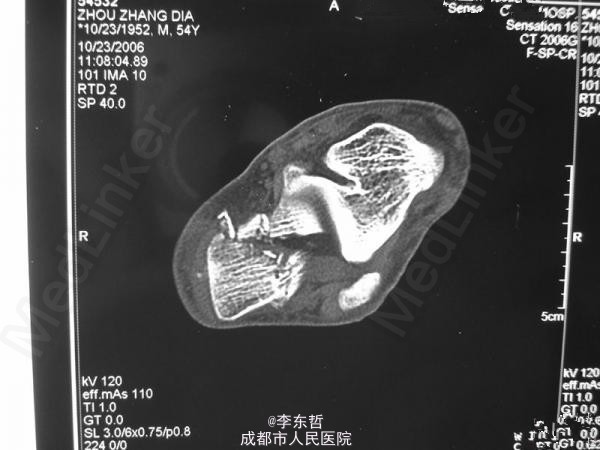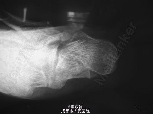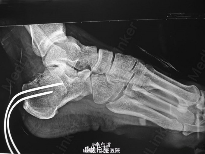 患者男性,60岁;高处坠落致左跟部肿痛10天入院,查体示左跟部略肿,压痛,无皮裂出血;予刚针撬拨术复位。