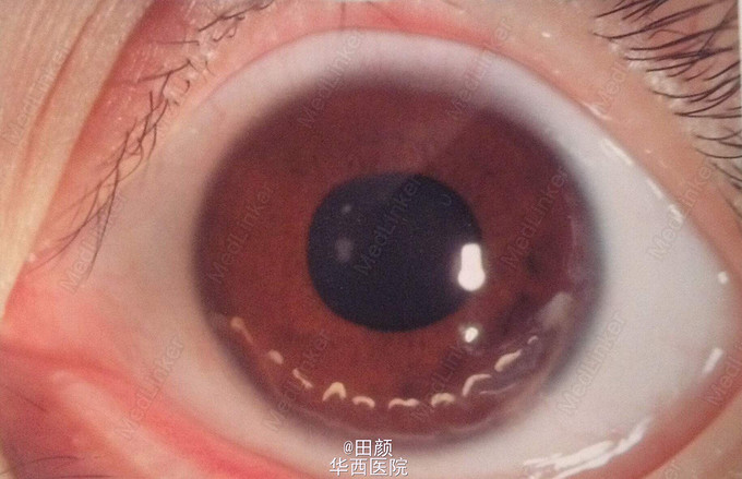 患者女,17岁,左眼畏光、流泪、异物感半年,下方角膜缘出现缝线样间断白色变性,左眼视力逐渐下降。乍一看,我第一反应想的是角膜寄生虫,仔细一看除了缝线样改变,其下方的角膜边缘也有变性样改变,那么最终诊断到底是什么?