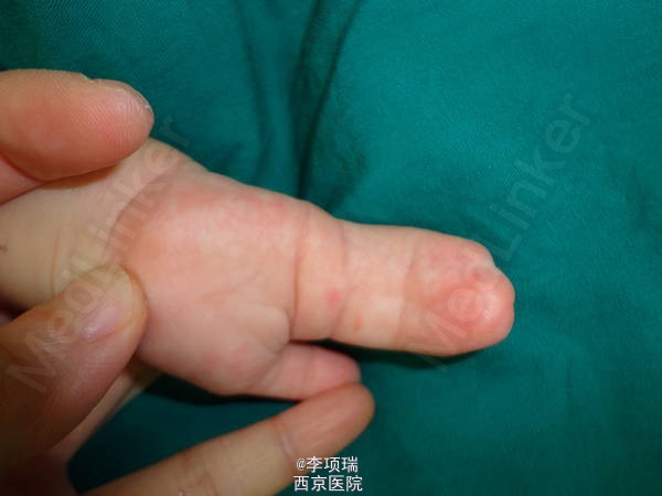 患者女,10月,右手2、3并指伴低3指多指、缺指畸形,手术行2、3指分离、多指骨骼切除。