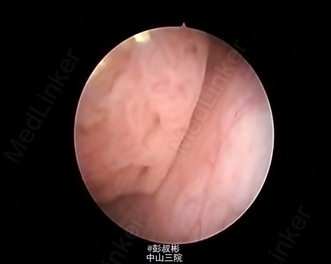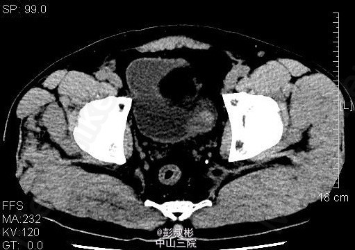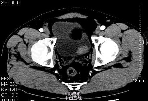 男性,54岁,血尿1月余。盆腔CT:膀胱左侧壁肿块,约27×23mm,考虑膀胱癌可能性大。患者家属要求保留膀胱,中腹部CT平扫+增强扫描+CTU,结合CTU:膀胱左侧可见一充盈缺损影,大小约34×25mm,双侧肾盂肾盏未见扩张,其内未见异常密度影,双侧输尿管通畅,未见增宽或狭窄。双肾大小、形态未见异常,双肾可见多发低密度影,CT值-15~15HU,最大约14×13mm,增强扫描强化不明显。双侧肾上腺大小、形态未见异常,其内未见异常密度影,增强扫描未见异常强化。膀胱充盈良好,膀胱左后壁可见一类圆形肿块向腔内突出,大小约34×25mm,增强扫描可见明显强化。前列腺不大,其内未见异常密度影。胆囊体积不大,囊壁增厚,可强化,其内未见异常密度影。片内所见肝实质密度普遍性减低,CT值约48HU,低于同层面脾实质CT值。