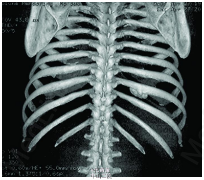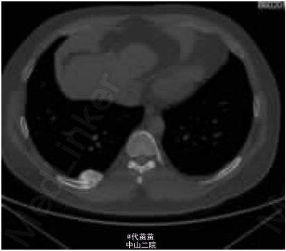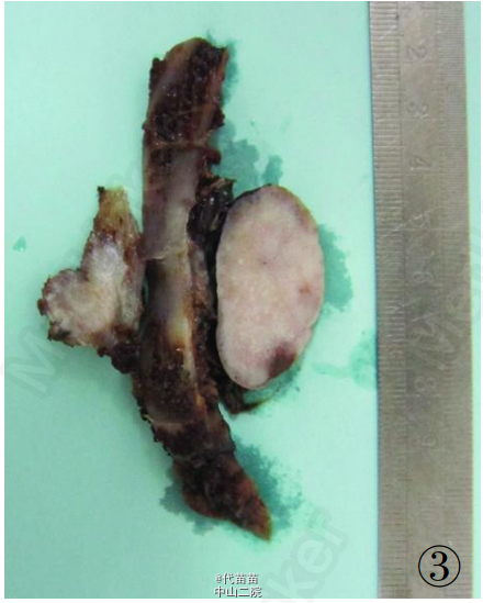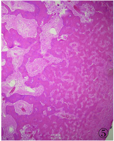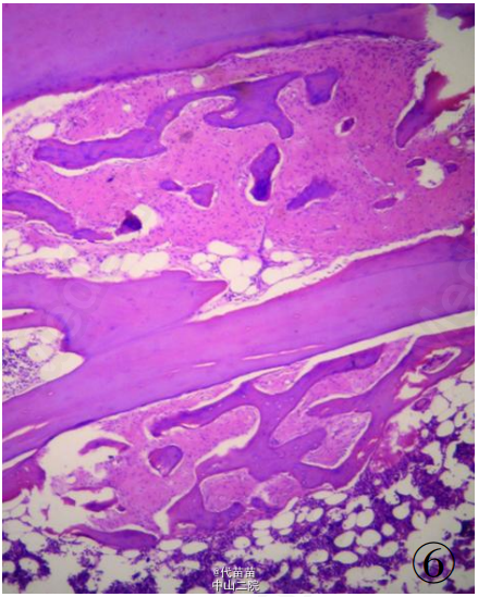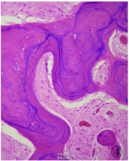 患者男性,40 岁。因体检发现肋骨肿块入院。患者无其它特殊症状,血生化检查基本正常,无放、 化疗史及Paget病史。CT检查示右侧第九后肋骨旁一团块状混杂高密度影,肿块边界尚清,位于肋骨表面,非髓内生长,向胸腔隆起,位于壁层胸膜与肋骨之间,与骨皮质有蒂相连(图 1、2)。临床考虑良性病变骨软骨瘤可能,遂行手术切除一段肋骨及表面肿块,送病理检查。 病理检查:眼观:送检肋骨1段,长9cm,宽2cm,骨表面隆起卵圆形肿块,4 cmX2 cmX2 cm 大小,质硬,切面灰白色,实性,与骨皮质有蒂相连,蒂部骨皮质浸润(图 3)。镜检:肿瘤由大量狭长且具平行排列倾向的高分化骨小梁构成,以编织骨为主,部分骨小梁已成熟为板层骨,大部分骨小梁周围缺乏成骨细胞被覆,部分区域已逐渐移行为有成骨细胞被覆的板层骨,瘤骨内可见骨重建过程中形成的粘合线,即所谓“Paget” 现象(图 4)。骨小梁间充满低细胞性纤维组织间质,梭形成纤维细胞形态温和,细胞核卵圆形,缺乏不典型性,部分肿瘤性骨小梁之间有脂肪髓形成,但无造血组织。肿瘤表面的骨样组织较幼稚,深部为相对成熟的粗大编织骨和板层骨(图 5),蒂部皮质和近皮质的髓腔内有局灶性肿瘤浸润(图 6)。肿瘤内含多灶性高分化软骨,软骨细胞排列紊 乱无极性,由于部分软骨位于肿瘤表面,故影像学和病理学类似骨软骨瘤改变。病理诊断:右侧第九后肋骨旁骨肉瘤。 骨旁骨肉瘤临床表现为骨表面缓慢生长的无痛性肿块,质硬,病程较长,可达数年。骨旁骨肉瘤预后较好,其5 年生存率达91% ,最佳治疗方案是大块肿瘤完整切除,切除范围应包括肿瘤周围的正常组织和软组织内的卫星病灶。若不完整切除则很容易复发。复发性肿瘤易发生去分化改变,称去分化骨旁骨肉瘤,其预后类普通型骨肉瘤,治疗原则和普通高级别骨肉瘤一致。 骨旁骨肉瘤可以说是骨肉瘤中的“异类” ,因为其不仅分化好,类似良性骨病,而且在骨表面生长,在病理诊断时须注意与以下三种良性骨病鉴别:(1)纤维结构不良。本例虽然部分肿瘤性编织骨呈不连续的字母状结构,在编织骨之间为高分化纤维,类似于纤维结构不良,但纤维结构不良是一 种纤维化生骨,伴有骨的成熟障碍,不会成熟为板层骨,也不会出现板层结构瘤骨在改建塑型过程中形成“Paget”现象。本例镜下见瘤骨比较成熟、 粗大,大部分相互连接成网,并有平行排列倾向,肿瘤表面骨样组织幼稚,深部较为成熟,并形成板层骨,成熟瘤骨内能见到“ 孕葬早藻贼” 现象。此外纤维结构不良均在髓内生长,不会在骨表面外生性生长,故影像学改变即可排除纤维结构不良。(2)骨软骨瘤。本例肿瘤内含有少量高分化软骨组织,由于部分软骨位于肿瘤表面,需与骨软骨瘤鉴别。骨软骨瘤蒂部的骨皮质常有缺损,肿瘤内的松质骨与宿主骨的正常松质骨相连续,二者相互融合。而骨旁骨肉瘤常环绕宿主骨在骨膜外生长,与髓腔不相通,肿瘤与骨密质之间有狭长的透亮带,即残存的骨膜;骨软骨瘤软骨帽下是由软骨化骨形成的松质骨小梁,骨小梁间隙内充满正常的造血性红髓或脂肪性黄髓,而缺乏骨旁骨肉瘤的成纤维细胞成分。同时骨旁骨肉瘤内的软骨组织、 结构和分布随意紊乱,缺乏骨软骨瘤明显的分层结构。(3)骨旁骨瘤。大多位于颅骨表面或副鼻窦内,分化成熟的骨小梁之间为脂肪细胞和小血管,缺乏纤维母细胞性间质。
