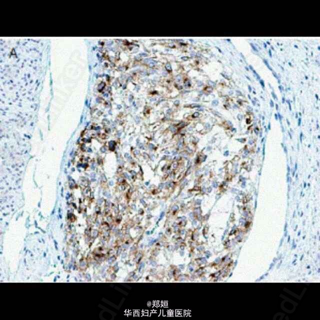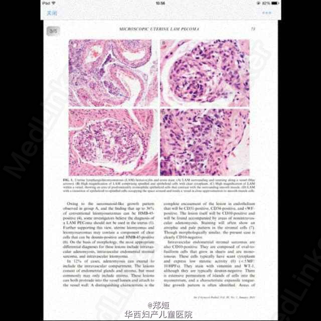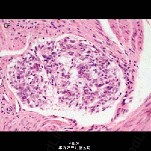 46岁女性,P3,因痛经和月经过多入院,行腹腔镜下子宫次全切术。 术后病检可见高倍镜下在一个管腔内主要是嗜酸性的上皮细胞和周围的平滑肌
