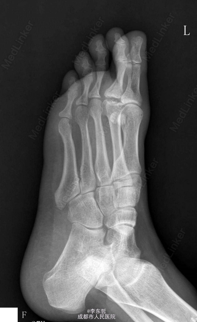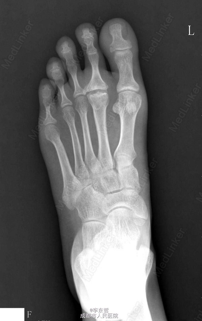 患者青年女性,因脚底疼痛2月加重3天来院就诊,入院后x线片出现“骨端烟头征”:软骨坏死的X线征之一,正常关节面变模糊,表面参差不齐,如燃烧的烟头样;提示第二跖骨头坏死迹象。