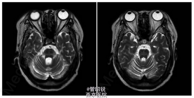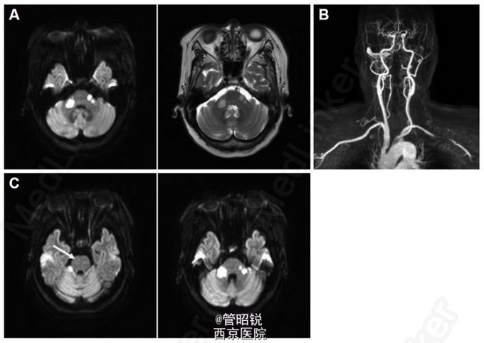 患者,女,71岁。有高血压和非胰岛素依赖型糖尿病病史。以突发的眩晕和共济失调入院。入院时血压146/98mmHg,心率97次/分,节律整齐。神经系统查体,神志清,除构音障碍外,无明显异常。小脑功能测试显示严重的共济失调,站立时需要扶持。双侧肱二头肌和膝反射减弱。巴彬斯基征阳性。T2WI 弥散加权显示双侧脑桥和右侧小脑急性腔梗。MRA显示严重的双侧椎动脉闭塞。给予口服阿司匹林治疗。三天后,病情进展为左眼外侧凝视受限和水平性复视。再次进行了检查,显示右侧脑桥正中旁的新发小的急性腔梗。静脉给予肝素治疗5天后,症状逐渐改善,但共济失调仍存在。转入康复医院1年后,眩晕减轻,可以扶拐行走。随访的T2WI显示橄榄脑桥小脑萎缩和脑桥十字征。