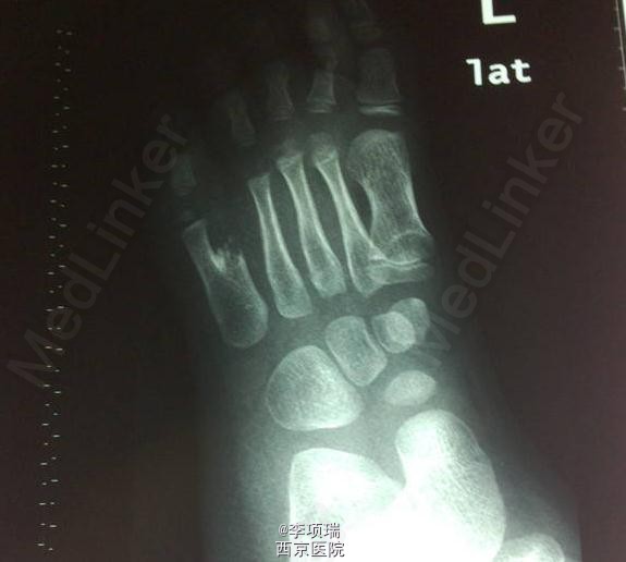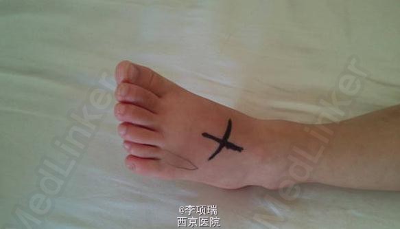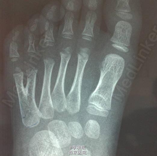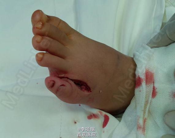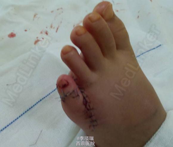5岁女童,左足第五趾多趾,行多趾切除+肌腱移位术。