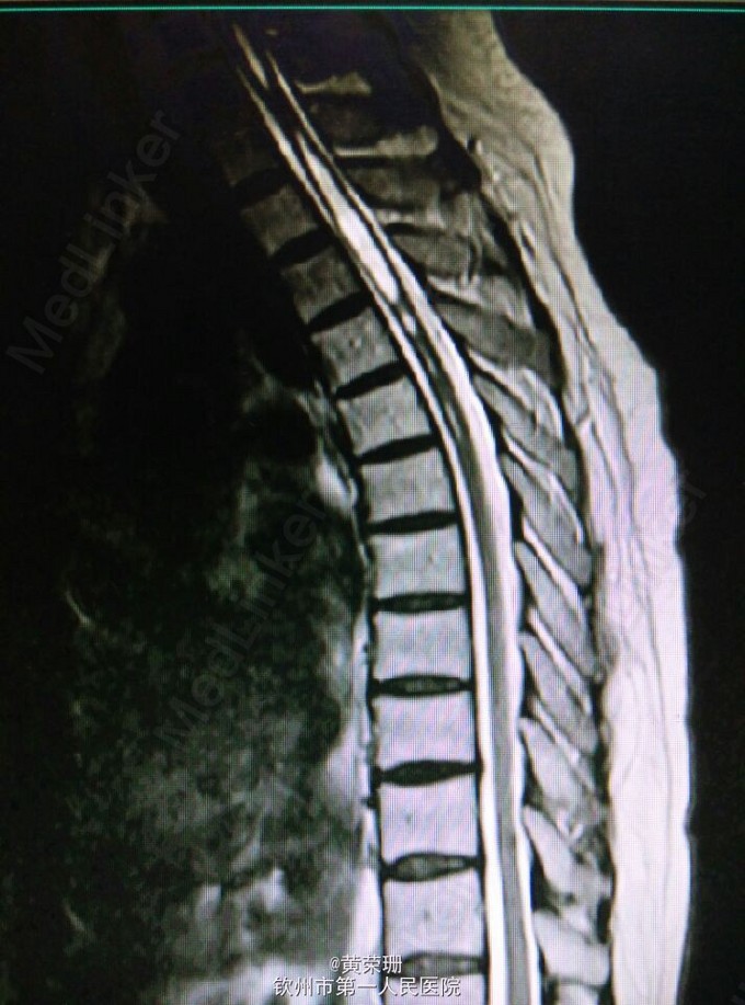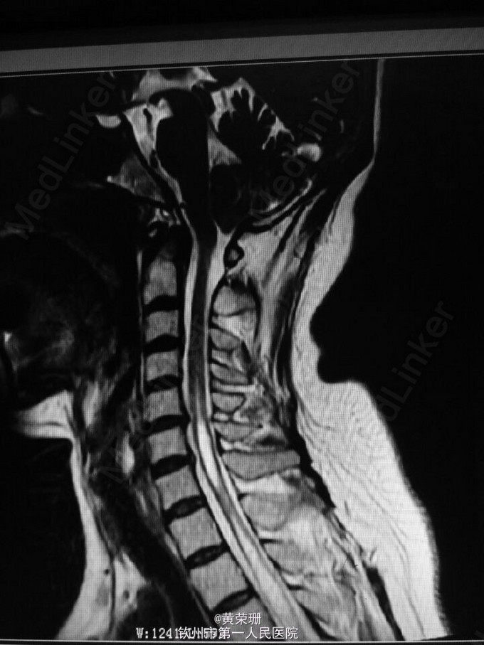 52岁女性患者,既往有颈椎病史。诉反复头晕1月余,伴晕眩,平卧后起立时明显。查体:神清,言清,双上肢、下颌部浅感觉减退,右侧明显,双上肢腱反射(++),双下肢腱反射(+),肌力5级,肌张力正常。入院后行头颅+颈椎MRI发现脊髓空洞症。