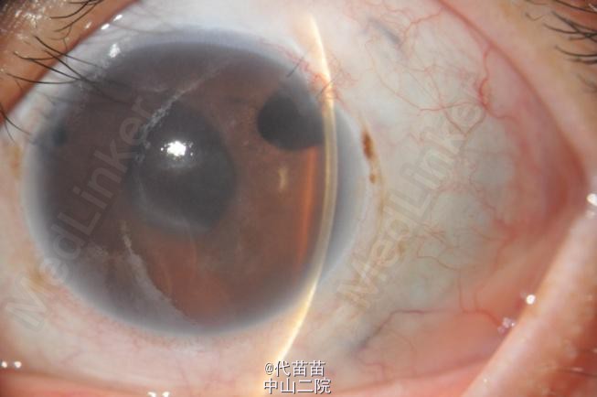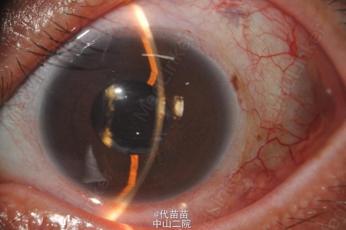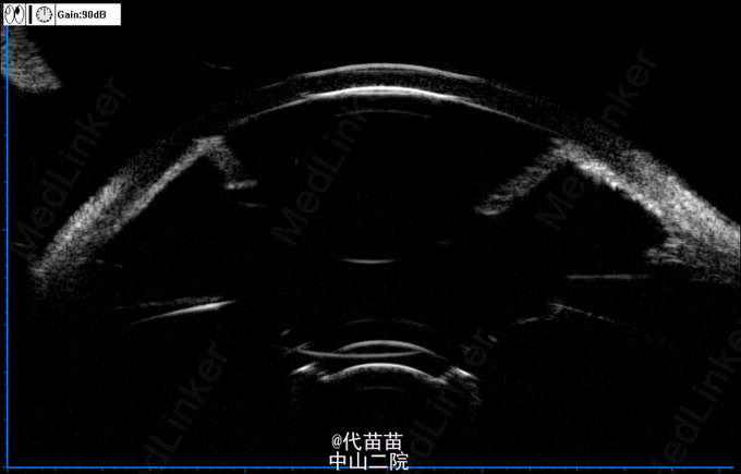 患者女,42岁,1月前诊断为“左眼视网膜脱离”,行“PPV+PPL+重硅油填充术”,术中见视网膜全脱离、下方脉络膜脱离、黄斑中心凹处及3点钟方向近赤道部可见圆孔,术程顺利。3天前无明显诱因突感左眼红痛、视物模糊,测眼压左眼56mmHg,予局部三联及口服降眼压药物处理,眼压控制不良,波动在48-55mmHg之间。双眼均20年前行白内障手术。 PE:左眼视力HM/20cm,眼压42.7mmHg,结膜全周瘢痕,角膜水肿,CACD:2CT, 周边至中周部前房消失,前房内可见硅油滴。晶体缺如, 前囊膜完整,玻璃体腔重硅油填充,视网膜后极部视网膜平伏, 周边部见环扎嵴及散在激光斑, 豹纹状眼底, 视乳头大小、色泽正常, C/D 0.3,房角因角膜水肿,窥不清。右眼已失明。UBM:左眼全周房角关闭、前房及玻璃体腔眼内填充物(重硅油填充)、无晶体眼 诊断:继发性青光眼 os无晶体眼ou 治疗:散瞳、抗炎、脱水、降压,左眼激光前囊切开术,眼压未降。后行左眼鼻上方周边虹膜切除术,眼压仍高,再次行左眼颞上方周边虹膜切除术。眼压最终降至<15mmHg。