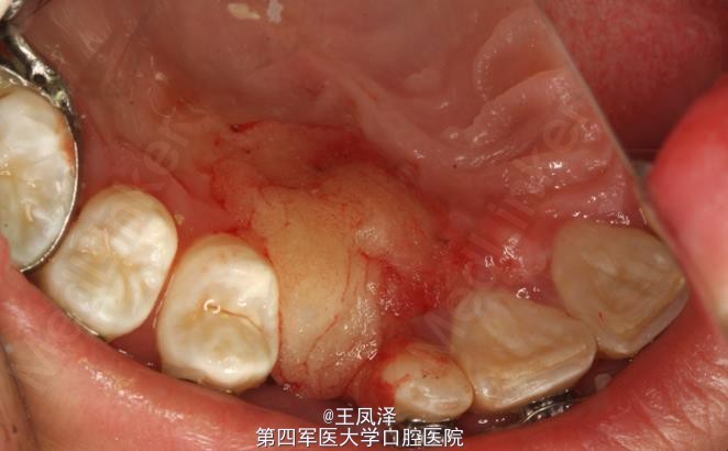 患者、李xx、男、13岁。主诉:右侧乳牙滞留,要求口腔检查。专科检查:上颌右侧乳尖牙未脱落,牙冠重度磨损。cbct检查:13高位埋伏阻生。13牙冠位于12、11之间。牙冠周围有牙囊影,牙冠位于12腭侧。根尖位于14、15区域。诊断:上颌尖牙高位Ⅲ阻生。处理:(1)正畸科建议拔除滞留乳Ⅲ,外科开窗牵引13.(2)13位置过高,有牵引失败可能,如不成功建议拔除