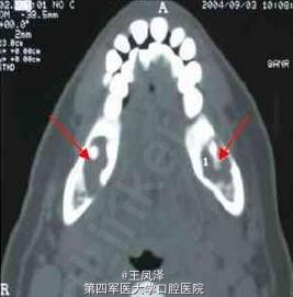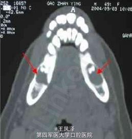 患者女性,49 岁。主诉:右侧后下牙痛近1 年。CT 下颌骨轴扫示:双下颌骨体部齿源性囊肿。术后病理证实。