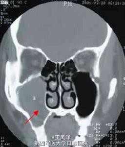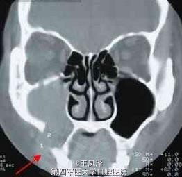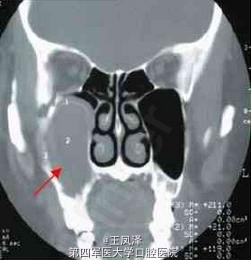 患者女性,38 岁。主诉:发现右面颊部肿物一个半月。查体:右颧弓下方2.5cm×3cm 肿物,囊性感,与周围组织无粘连。CT 鼻窦冠扫示:右上颌骨囊肿向内突入右上颌窦(齿槽骨缺损),向外突向颌骨外的软组织中。术后病理:右上颌骨囊肿,部分囊壁可见慢性炎细胞浸润。