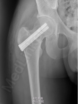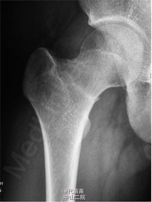 患者男 , 17 岁 , 战士。因右髋部疼痛逐渐加重 1 个月来诊。患者于 2013 年 9 月入伍后开始训练 , 1 个月后无明显诱因出现右髋部疼痛 , 行走及训练时加重 , 休息后能缓解 , 无低热、盗汗 , 无昼轻夜重等现象 , 曾到师医院就诊 , 给予对症治疗 , 后疼痛症状逐渐加重。影响活动 , 不能坚持训练来本院就诊并入院。查体 :一般状况良好 , 心肺腹无异常。右髋部及腹股沟区皮肤无红肿 , 皮温不高 , 无静脉显露 , 右髋后上方压痛 , 无放散 , 右髋部叩击痛阳性 , 右髋关节活动尚好 , 活动时疼痛加重 , 未触及明确包块。血、尿、便化验检查无异常 , 血清碱性磷酸酶 126 U/L。X 线片示 :右股骨颈基底断裂 , 无明显移位 , 局部骨痂形成 ( 见图 1)。诊断:右股骨颈疲劳骨折。入院后完善检查及术前准备, 2 d 后给予行小切口三枚空心螺钉内固定术 ( 见图 2)。术后对症治疗,半个月后拄拐不负重行功能锻炼, 出院后 3 个月复查 X 线片示 :右股骨颈基底部骨小梁及骨皮质连续 , 骨折线消失 , 达到骨性愈合。 应力性骨折又称疲劳性骨折 , 常发生在运动员及新兵训练中 , 此类人员频繁的超负荷训练致骨每天承受反复负荷,以致骨发生局部微损伤 , 如果这种损伤不断积累 , 超过机体修复能力 , 就会产生骨的疲劳性骨折。此类患者往往无明确的外伤史 , 但有大运动量的病史 , 尤其是军人及运动员不能忽视 , 多数患者患侧髋后上部及臀后部疼痛 , 活动时加重 , 休息后缓解 , 部分患者随着病情发展 , 停止运动或休息后仍不能使疼痛缓解 , 查体时 , 患髋后上方及臀部有压痛 ,局部偶有肿胀 , 大粗隆处叩击痛阳性。辅助检查 :DR 及 CR一般可在 1 个月内出现骨膜反应征象 , 大约 3 个月左右由于骨折修复 , 可见有骨痂形成 , 但无法与相关疾病做出鉴别诊断 , CT 的高分辨率扫描 , 能清晰显示骨折线及骨膜增生 , 对平片不能早期确认的病例有较高的诊断价值 , 螺旋 CT 的三维重建可根据需要对高度怀疑的骨组织任意面及任何位置进行重建 , 以此可发现较细的骨折线 , 尤其对于股骨颈及坐骨支等解剖结构复杂区域的疲劳性骨折较适用。MR 其多方位多平面成像 , 敏感性优于 X 线片 , 特别是能早期显示骨折线 ,以及骨折周围软组织 , 髓腔内的水肿和出血。对那些X线片或 CT 扫描有疑问的疲劳骨折病例 , MR 有显著的早期诊断和鉴别诊断价值。 疲劳骨折治疗原则是早发现 , 早治疗 , 可限制原有运动 , 休息为主 , 对极少不稳定或移位的骨折 , 可采取手术固定。此外 , 在训练中 , 应科学施教 , 劳逸结合 , 因每个人的不同体质针对性的制定出训练计划 , 避免同一部位频繁、多次训练。如在训练中出现下肢某部位进行性疼痛 , 应及时来医院诊。