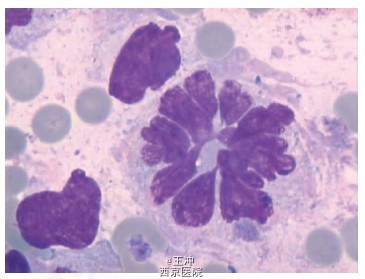 患者男性,62岁。因反复腰背酸痛2个月于2012年11月5日人院。 人院查体:体温37T,脉搏80次/min,呼吸20次/min,贫血貌,肝脾肋缘下未触及,神经系统未检出阳性体征。 血常规示:白细胞计数(WBC)2.3x109/L,血红蛋白(Hb)80g/L,红细胞计数(RBC)2.44x1012/L,血小板计数(PlO68x109/L。 外周血细胞分类:中性细胞0.70,淋巴细胞0.24,单核细胞0.06。 免疫球蛋白定量:IgG26.2g/L,IgA0.14g/L,IgM0.23g/L,k轻链31.20g/L,X轻链0.43g/L。 血生物化学检查:总蛋白86.7g/L,清蛋白31.3g/L,乳酸脱氢酶1221U/L,尿素25.60mmol/L,肌野341.7(xmol/L,尿酸1034.9μmol/L,血钙3.25mmol/L,血憐2.25mmol/L,β微球蛋白31.44mg/L。血清蛋白电泳见7-M蛋白,占35.6%。红细胞沉降率110mm/h,尿本周蛋白阴性。 骨髓象:增生明显活跃,异常浆细胞占0.95,该类细胞胞体大,外形不规则,胞质较丰富,灰蓝色或深蓝色,核形极不规则,易见扭曲折叠及花瓣形核,多者可分十数叶,核染色质较粗&,核仁不清晰,2~4个不等(图1)。 染色体检查:36-44,-X,-Y,1q+,2p+,3q+,7p-,11p-,+m1-m14。流式细胞术检测:该细胞群约占48.0%,CD5661.1%,CD3885.0%,HLA-DR24.3%,CD13898.8%。 影像学检查:胸椎正位片提示T8~T12陈旧性压缩性骨折,CT提示T9-L2椎体骨折破坏,其内充满软组织密度影,压迫脊髓,部分椎弓根骨折呈溶骨性破坏。全身骨扫描提示两侧肋骨及脊柱多发性骨代谢活跃灶。 经临床及实验室检查确诊多发性骨髓瘤(MM),给予VAD方案化疗:长春新碱每天0.5mg,多柔比星每天10mg/m2,地塞米松磷酸钠,静脉滴注第1天至第14天、第9天至第12天、第17天至第20天,1个疗程。化疗结束后,复查血常规、肝肾功能及免疫功能,均较前好转,目前患者病情平稳。