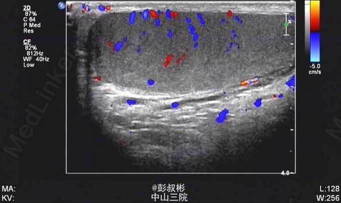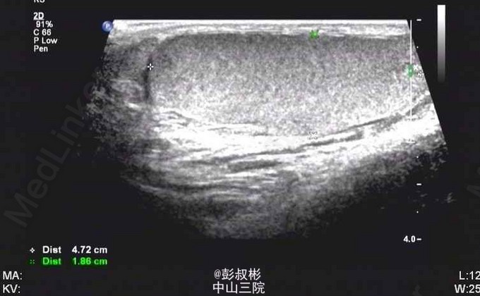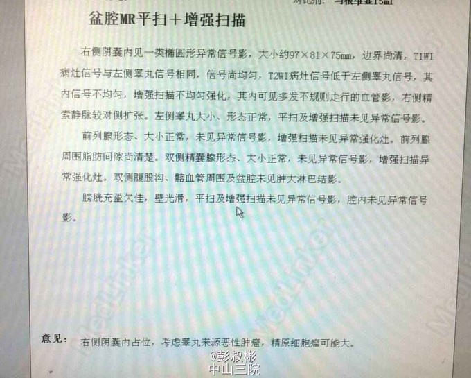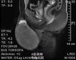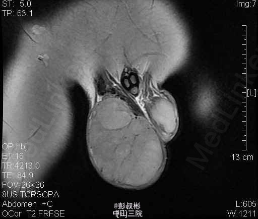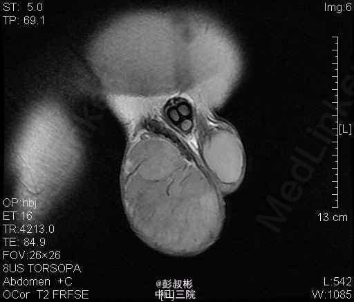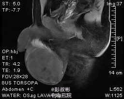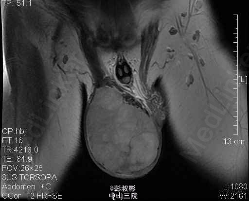 1、主诉:发现右侧睾丸肿大1年。 2、患者为青年男性,隐匿性起病。患者于一年前无明显诱因发现右侧睾丸变硬,并逐渐增大,无疼痛与牵引感,也不影响排尿和日常活动,未经任何诊治,近来自觉右侧睾丸钝痛,到我院门诊求诊,诊断为:"右侧睾丸肿瘤"。现为进一步诊治收入我科。起病以来,患者无寒战、发热,无恶心、呕吐、腹泻,食欲、精神、睡眠一般,大便正常,近期体重无明显下降。。 3、体格检查:双肾区无红肿、隆起,无叩痛,双侧肋脊点、肋腰点无压痛。腹平软,双侧输尿管走行区无压痛,膀胱区无膨隆,压痛阴性,双侧腹股沟区未触及肿物,阴毛呈男性分布,外生殖器发育正常,尿道外口未见异常,右侧阴囊内可触及右侧睾丸明显增大,约“20×10×8”cm大小,轻压痛,透光试验(-)。直肠指检:胸膝位,前列腺不大,质韧,中央沟存在,表面光滑,无结节,触痛阴性,指套未见沾血。 4、辅助检查:B超示:右侧睾丸肿瘤。盆腔MR平扫+增强扫描提示:右侧阴囊内占位,考虑睾丸来源恶性肿瘤,精原细胞瘤可能大。 5、诊疗措施:入院后予患者完善相关检查,三大常规及生化回报未见明显异常,未见明显手术禁忌症,考虑患者可耐受手术,拟予患者行右侧睾丸治疗根治性切除术。