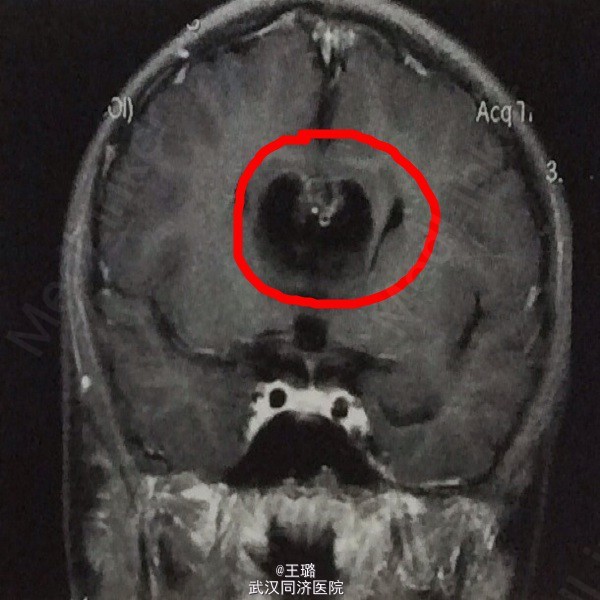 患者,2岁,因头痛、癫痫入院,体检神经反射微弱,病理反射未引出,皮肤感觉障碍,其余无异常。实检示:血常规正常,血生化白蛋白降低,肝肾功能正常。MRI示:双侧脑室分离,未见胼胝体结构,胼胝体区呈短T1、长T2信号病灶,中线居中。考虑为胼胝体缺如病瘤样物填充,遂行开颅切除,病检示:脂肪瘤。胼胝体缺如伴脂肪瘤是最常见的颅脑先天性畸形,属神经管闭合畸形,如有中胚层的脂肪组织渗入则会引起脂肪瘤。