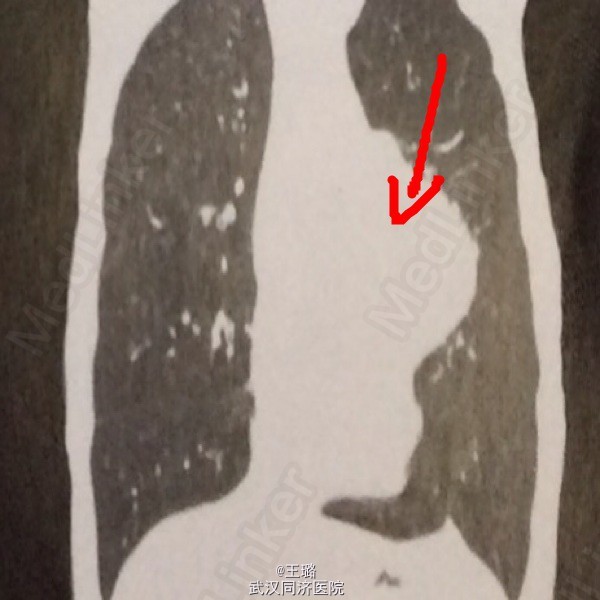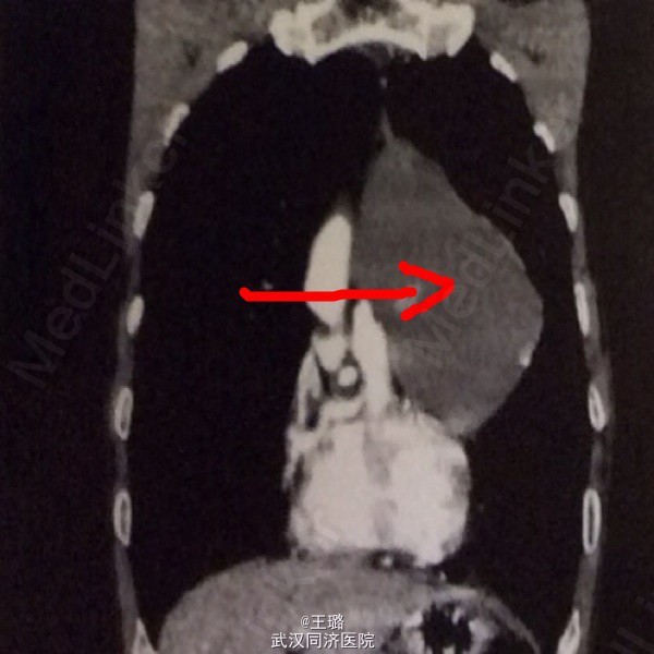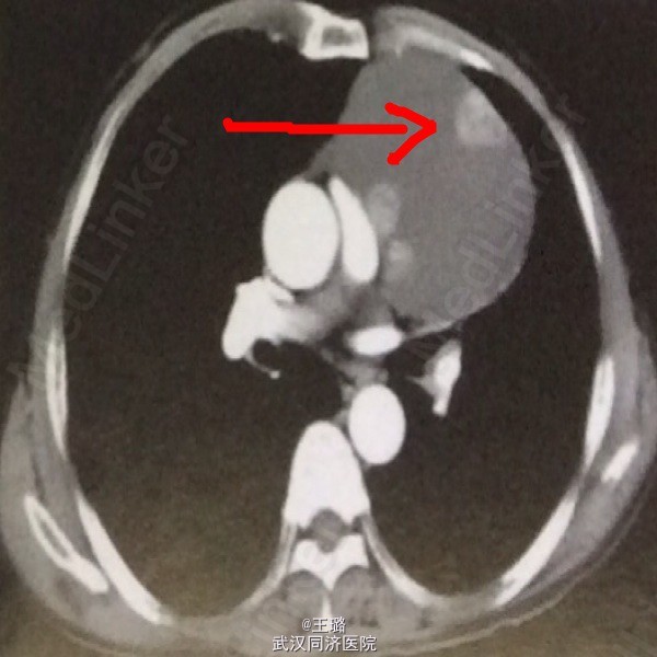患者,男,63岁,胸闷一星期加重两天入院。体格检查:两肺呼吸音稍粗,未闻及干湿啰音。实验室检查:中性粒细胞增高,淋巴细胞降低,其余无异常。CT示:前纵隔左侧出现类圆形囊性病灶,边缘可见实性结节。MPR示:囊性占位内可见细条状分隔,囊肿与周围结构界限清晰。遂给予手术切除,术后病检示:多房性胸腺囊肿。胸腺囊肿为纵隔良性肿瘤,较少见,若囊肿破溃穿入心包可引起心包填塞。