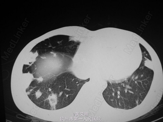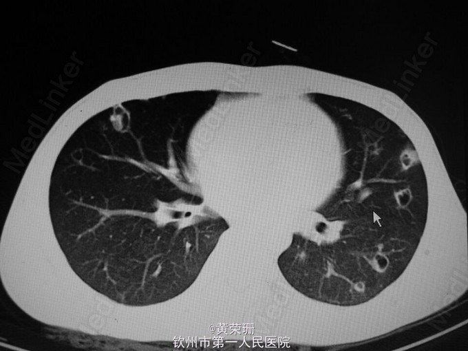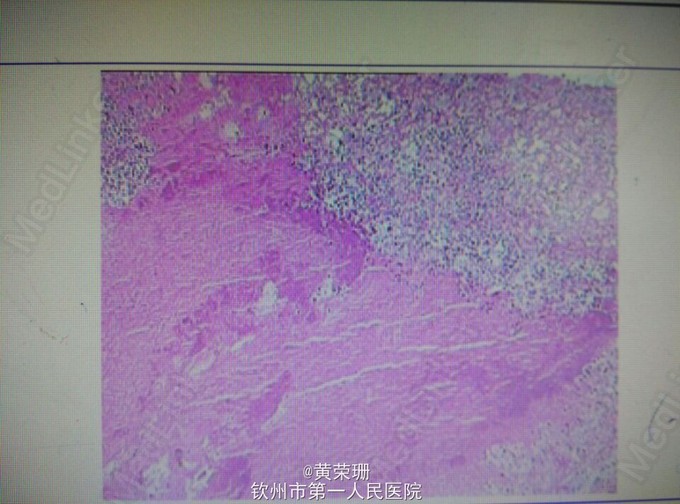 21岁青年男性患者, 急性起病,既往有静脉注射毒品史1月余。因“反复畏寒、发热20余天”入院。自诉20余天前以白开水化“毒品”静脉注射后出现畏寒、发热,体温最高达39.5℃,伴头部胀痛,浑身乏力,伴气促,活动后明显,伴咳嗽、咳痰,间中伴暗红色血丝痰,伴呕吐,为胃内容物,无明显腹痛、腹胀等。于当地门诊予“退热针”治疗后可退热,但易反复,15天出现双下肢几颜面部浮肿,于当地医院住院治疗,检查提示:WBC 25.4*10^9/L,Hb 58.2g/L,痰培养提示:金黄色葡萄球菌,伴少量白色念珠菌伴随生长。心脏B超:三尖瓣脱垂并关闭不全,治疗上余抗感染、输血、利尿等对症处理,但仍间中发热,遂至我院。 入院查体:心率112次/分,贫血貌,两肺呼吸音粗,双肺可闻及湿啰音,心界不大,心率112次/分,率齐,心音有力,三尖瓣听诊区可闻及3/6级收缩期吹风样杂音。 辅助检查:心脏B超:1.三尖瓣前叶赘生物(感染性心内膜炎),伴瓣口反流(重度)及前瓣穿孔,右房增大;2.左心室收缩功能测量值正常范围(图1)。胸部CT:1.考虑两肺感染(真菌感染?细菌感染?),2.两侧胸膜轻度增厚(图2-4)。入院后反复血培养、痰培养均未见培养出细菌几真菌。 主要诊断:1.感染性心内膜炎 三尖瓣赘生物并穿孔 三尖瓣重度关闭不全 2.肺部感染 患者入院后“哌拉西林他唑巴坦+阿米卡星”抗感染、强心、利尿、营养心肌等处理病情平稳后行三尖瓣置换术。术后病理:(三尖瓣)镜下见纤维性瓣膜局部增厚伴大量急慢性炎性细胞浸润,可见小脓肿形成,切表面有红染纤维素样炎性渗出物附着,结合临床符合感染性心内膜炎改变(图5)。