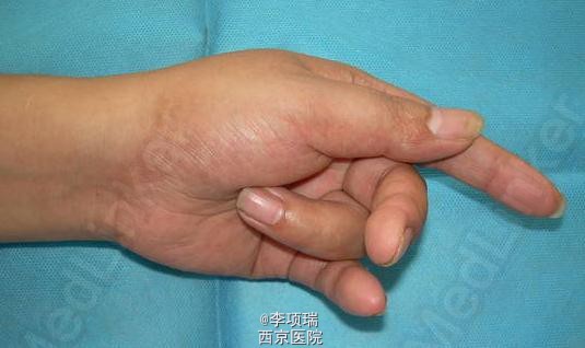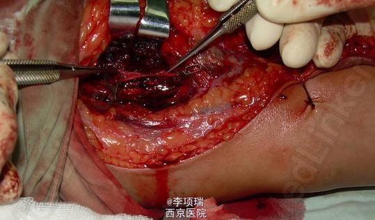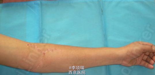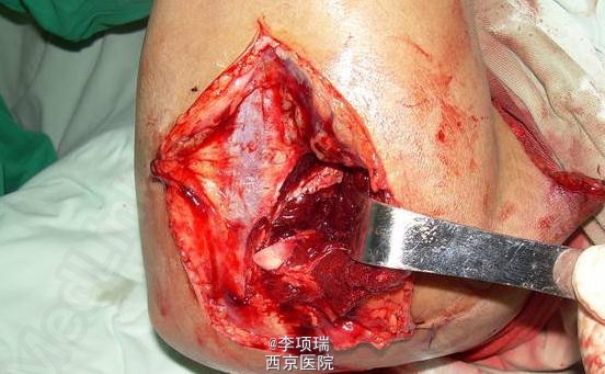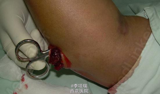 患者,男性,32岁,因刀刺伤肘部致疼痛,流血,活动受限一小时入院。伤如图示。 查体桡神经功能障碍明显。正中神经及尺神经正常。X线片示桡骨小头骨折。入院时以为只是比较轻的伤。术时发现上臂及前臂明显肿胀。才考虑是不是有血管损伤。 处理后复诊,患者功能恢复很好。