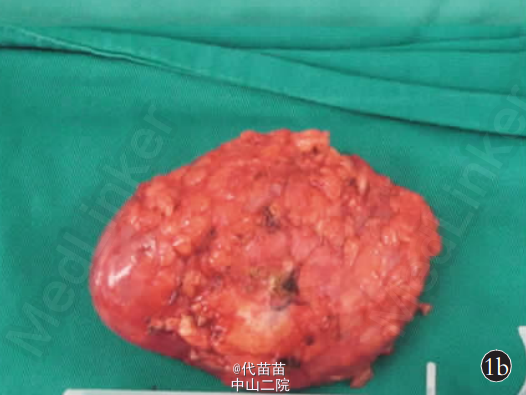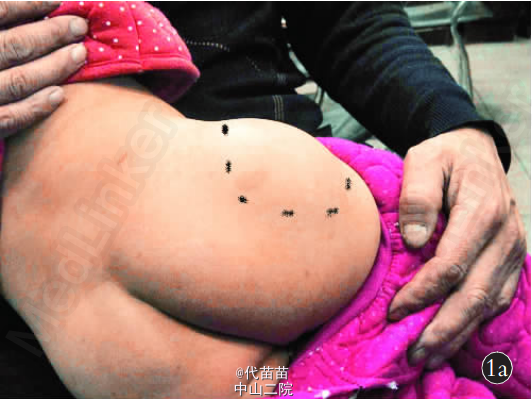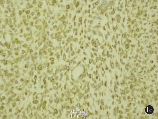患儿,男,22 个月,于 2011年1月13日入住我科,该患儿家属叙述 15 个月前因右臀部肌注百白破疫苗后,臀部注射区出现肿物,约指甲大小,肿物韧硬,用力按压无明显疼痛感,不随体位改变,无还纳感,无夜间痛。因未影响日常生活,故未予特殊治疗。 此后肿物逐渐增大,8个月前,右侧臀部肿物已如拳头大小(图 1a),遂在当地治疗,症状未见好转。1d前来我院行彩超检查,提示为右侧臀部皮下软组织内混合性肿物,血肿或炎性肿块可能性大。入我科后详细查体后见:右臀部外侧 可 触 及 9.0 cm×10.0 cm×3.0 cm大小包块 ,触之硬韧 ,无明显压痛,无放射痛,与周围组织分界较清,活动度良好。实验室检查:C-反应蛋白 0.20 mg/L,血沉4 mm/h,嗜酸性粒细胞百分比 0.01%,嗜酸性粒细胞绝对值 0.16×109。 入院后完善术前检查择期行右臀部肿物切除术, 术中以肿物为中心沿臀大肌走行取斜行切口,见肿物位于皮下与深筋膜之间,包膜完整,血运较丰富,肿物大小约为 8 cm× 6 cm ×6 cm。术中注意无瘤化操作,于包膜外 1~2cm 正常组织处锐性分离,完整切除肿物。切开肿物,见肿物中央为多囊性,有分隔,内有淡黄色胶冻样物质,实质为灰白色(图 1b)。 将肿物送检快速病理回报:梭形细胞肿瘤,考虑纤维肉瘤可能性大,Ⅰ期行扩大切除,切缘组织送检快速病理未见肿瘤细胞,剩余组织送检常规病理,常规病理回报: 间叶源性肿瘤, 考虑为婴幼儿纤维肉瘤可能性大。建议行免疫组化,免疫组化结果:右臀部婴儿型纤维肉瘤(图 1c)。病理诊断为:婴儿型纤维肉瘤。 婴儿型纤维肉瘤是一种相对少见的肿瘤 ,又 称 为 先 天 性 纤 维 肉 瘤,系指发生在新生儿、婴儿和幼童的罕见的软组织肿瘤。根据世界卫生组织(WHO)定义:5 岁以下个体发生的纤维肉瘤称为先天性纤维肉瘤。 婴儿型纤维肉瘤的生物学行为呈惰性经过,往往临床上没有引起重视,病理形态上与成年纤维肉瘤相似,一般多在患儿 1 岁内诊断,约 1/3~1/2 为先天性,较易复发。 本病多发生在 2 岁以内的婴幼儿,38%的 患儿出 生 时 即有,51%患儿出生后 3 个月以内发生。 有些患儿虽发生于出生后 3 个月内,但实际发生时间常难确定 ,故 CFS以先天性居多。 本病男性比女性好发,多发生在四肢远端如足、踝、手腕,少数位于躯干中轴位置,但也可发生在眼眶、口腔、胆道、腹膜后和结肠等部位。CFS 临床表现多为局部软组织肿块和周围软组织受压现象。 需要与 CFS 鉴别的疾病: ① 细胞丰富的婴幼儿纤维瘤病,如腱鞘纤维瘤、结节性筋膜炎、腹壁韧带样瘤等。 婴幼儿纤维瘤体积较小,镜下细胞相对不丰富,很少有较多不分裂象,一般无明显坏死区。细胞遗传学与分子遗传学分析,对两者鉴别有用。 ② 恶性纤维组织细胞瘤,恶性纤维组织细胞瘤除了梭形细胞外尚有在 CFS 中 不 可 能 出 现 的 圆 形 组织细胞样细胞、泡沫细胞和巨细胞。这是多形性恶性纤维组织细胞瘤的特征,而 CFS 的特点是细胞相对一致。 ③成人型纤维肉瘤,年龄及染色体检查最为重要。其他如肿瘤体积相对巨大,镜下炎性浸润比较明显,出现退化,有利于先天性/ 婴幼儿纤维肉瘤的诊断。 相对成人纤维肉瘤,CFS 表现为相对惰性的临床过程。与成人纤维肉瘤相比,CFS 除复发率较高外转移率和死亡率均明显低于成人。治疗上,应当对肿瘤实行早期的扩大切除手术,这样能够保留肢体并对大部分患者有效。本例患儿虽然发现较晚,肿瘤较大,但累积周围软组织比较轻,术中完整切除肿瘤并行局部扩大切除,术后 3、6、12 个月随访复查均未发现复发及转移,考虑预后应较好。