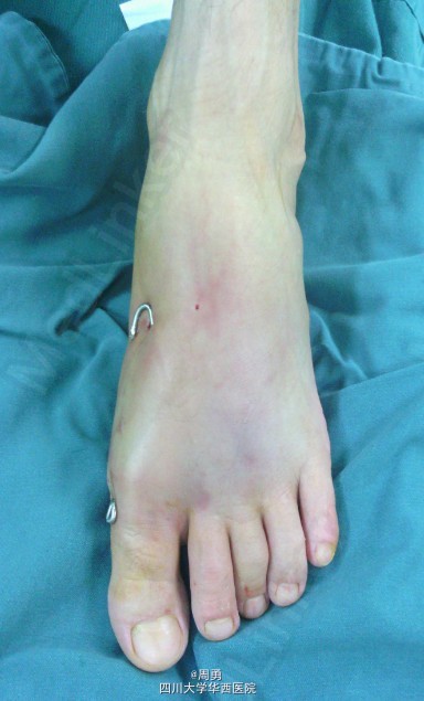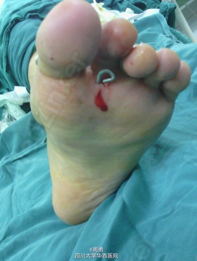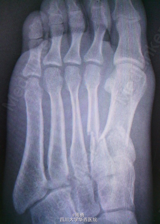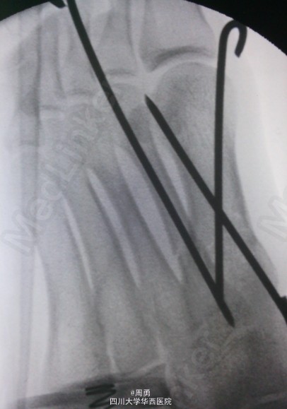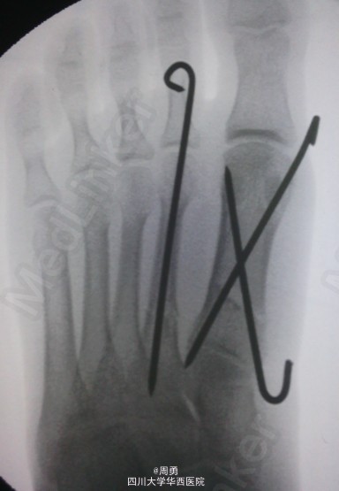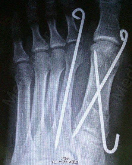 此手术为做博士住院总时所做,复位比较满意,价格便宜,效果确实。病例简介:33Y,M,诊断:左足第1,2跖骨中近1/3骨折;处理:行闭合复位克氏针内固定术。
