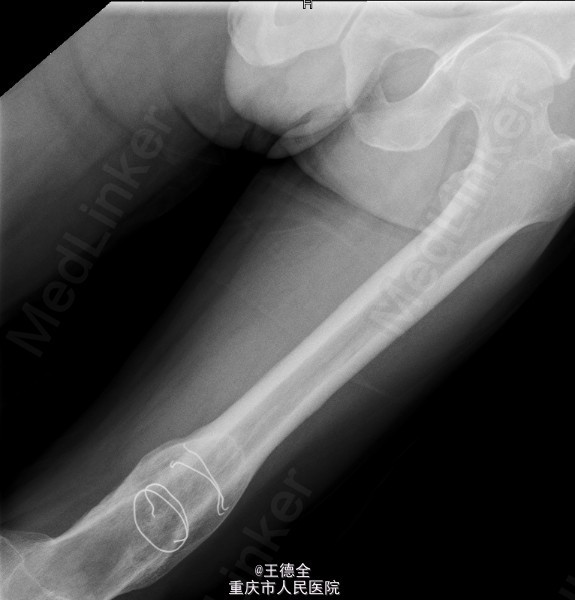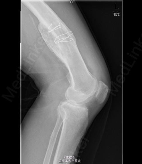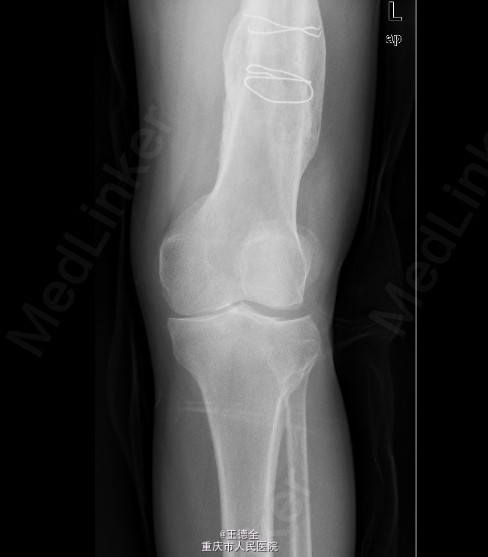 患者男,40岁,因“左股骨下段骨折术后4+年,左膝反复肿痛2年余”入院;自诉于4年前不慎被石块砸伤左大腿,伤后即觉左大腿疼痛,流血,左下肢活动障碍,患者伤后即到当地医院就诊,诊断为:"左股骨下段开放性骨折",予骨折切开复位内固定术,术后3个月下地行走,术后内固定螺钉松动、脱落,近两年来出现左膝关节肿胀、疼痛,活动时肿胀、疼痛症状加重,无畏寒发热、肢端麻木等,患者病后曾到当地医院就诊,予服药治疗后症状无明显好转,为进一步诊治遂来我院就诊,门诊拟"左膝骨性关节炎"收住我科,病程中,患者一般情况尚可,睡眠、饮食可,大小便正常,体重无明显改变。目前积极完善术前检查,拟做关节镜下关节清理术+左膝腘窝囊肿切除手术治疗。