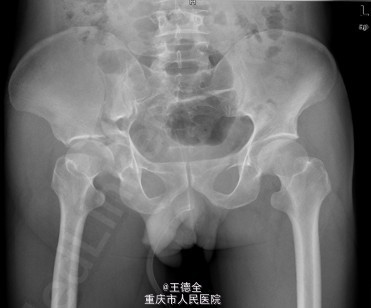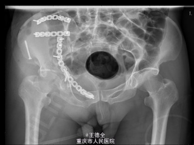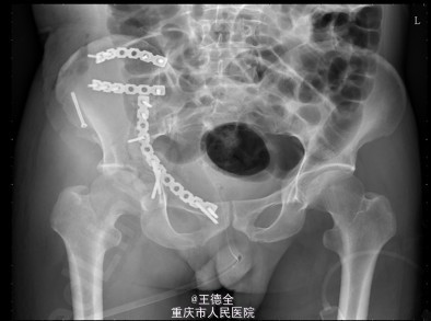 患者男性,51岁,因“高坠伤致左腰部及右髋部疼痛伴活动障碍3天”入院。急性痛苦面容,神志清楚,平车送入病房,右髋部软组织稍肿胀,局部皮肤完整,未见明显皮疹,挫擦伤及出血点.右股骨髁上骨牵引在位,左腰椎伴明显压痛,骨盆挤压实验阳性,可扪及骨擦音,骨擦感.双下肢感觉,活动,血循良好,足背动脉搏动好;右踝关节主动活动受限,被动活动正常。右侧各足趾背伸、跖屈活动正常,其余各关节活动正常。骨盆X线片示:右侧髂骨、髋臼、双侧耻骨上支、右侧耻骨下支多发骨折,左侧髂骨翼骨折,骨盆出入口右侧份形态失常。 初步诊断:右髋臼粉碎性骨折(Judet X 型) 诊疗计划:完善双下肢静脉彩超等检查;给予预防深静脉血栓、骨牵引治疗;给予止痛等对症支持治疗;密切观察病情变化,根据病情及时处理。