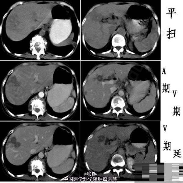 病史:女性,41岁,肝区不适伴反复双肾区疼痛1年。 上腹CT:肝内多发斑片状或类圆形灶状密度异常,占位效应不明显,边界模糊,平扫呈不均匀稍低密度,局部可见点状高密度钙化影。增强扫描:动脉期病变周围正常肝实质可见片絮状轻度一过性强化,病变内部可见强化的小血管影;静脉期病变呈低密度影,内部无明显强化;延迟扫描病变范围缩小,周边轻度强化。 影像检查发现:T10至L1椎体破坏,并冷脓肿形成;左下肺结核。 临床诊断:肝结核、脊柱结核、肺结核。 肝结核 Hepatic tuberculosis 肝结核是一种少见病,且多继发于其他器官结核的播散。 发生在肝实质的结核大致可分为:粟粒型、结节型和混合型。 (1)粟粒型:较常见,为多发或弥漫粟粒状小结节灶(直径≤2cm),常为全身结核的一部分,临床诊断并不十分困难。影像学可见肝肿大和细小结节灶。对非钙化性病灶直径< 0.5 cm者,CT、MR检查大多难以发现。 (2)结节型:直径> 2 cm,较少见,由粟粒灶或细小结节灶融合而成,因易于发现而国内外文献报道多为这一类型。若结核性肉芽肿液化坏死不明显或病灶以纤维组织为主,CT表现为低密度肿块影,病灶可呈轻度边缘强化,影像学表现无特征,诊断困难。当结核性肉芽肿内钙盐沉着时,可在病灶内出现斑点状甚至“粉末状”钙化灶,有一定的特征性。 (3)混合型:即粟粒大结节型,CT表现为多发粟粒状钙化伴单发结节状低密度灶。多发不同密度改变的病灶为肝结核较为特征的CT征象。这种表现反映肝结核同时存在不同病理时期的病灶,包括结核性肉芽肿、液化坏死、纤维化或钙化。 肝结核的其他表现:腹腔淋巴结肿大;“卫星灶”;脾肿大或感染结核;肝外结核史或结核接触史。肝外结核史在肝结核的诊断中尤为重要。