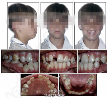 在切牙牙根发育阶段出现外伤导致上切牙缺失比较常见。这种情况下种植等修复存在一定的局限性(特别是创伤骨质)。患者10岁,2年前外伤导致11牙缺失,牙列拥挤。修复方法有两种,一种是拔除21牙(21牙存在牙髓炎症状),两侧侧切牙近中移动关闭间隙,下颌拔除前磨牙进行正畸。此方法无法建立I类关系,且前牙区美观不佳,甚至有可能出现骨质吸收。因而决定采用自体45牙移植,既能够获得满意的美观,也能够促进上颌骨垂直生长。