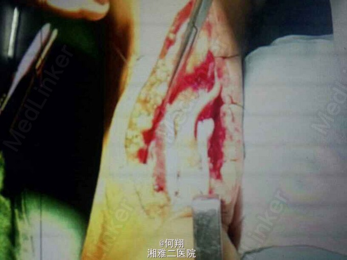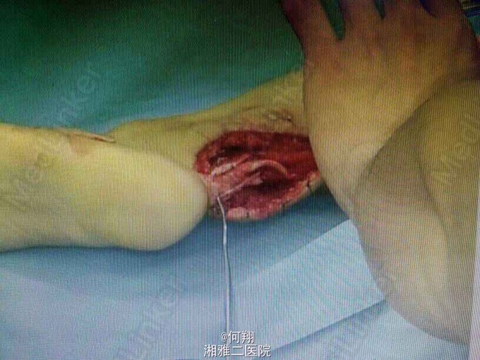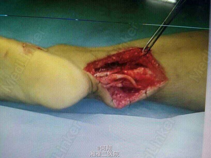 患者中年男性,左足跟腱部分断裂数年,现跛行,跟腱断裂处可明显触及空虚感,B超结果符合跟腱部分断裂,陈旧性。 取腓骨短肌肌腱,行跟腱修复术,术后行石膏外固定,后切口皮肤张力较大,但恢复尚可。