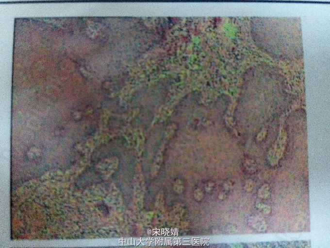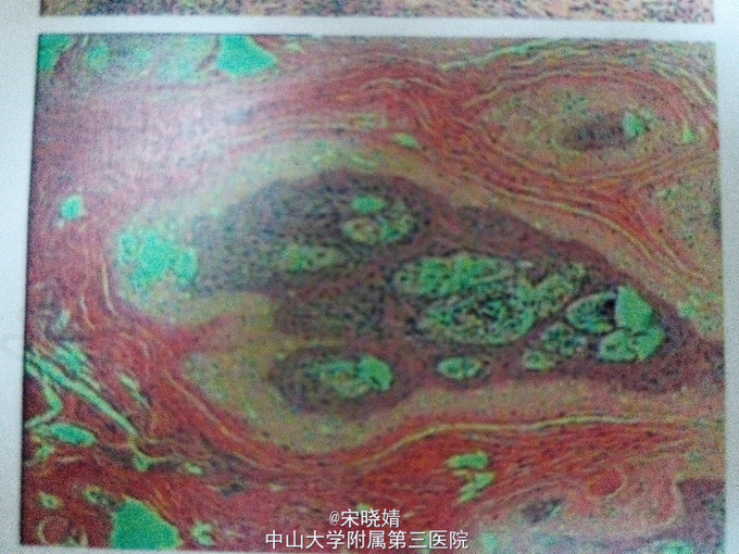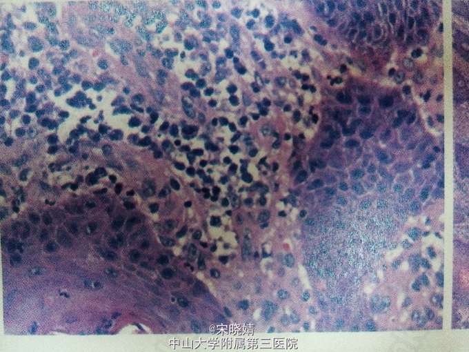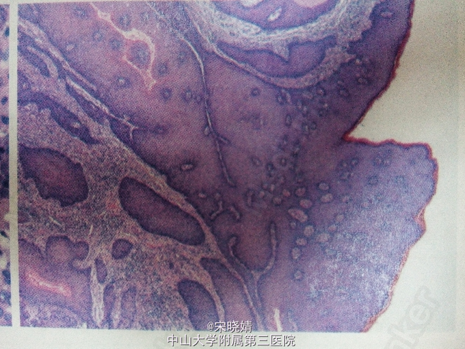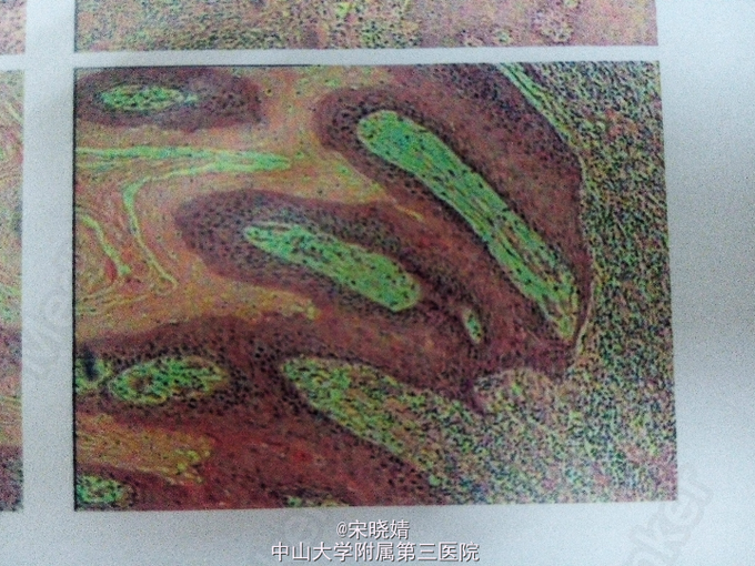61岁男性,因“龟头赘生物20年,破溃3年”入院。20年前患者无明显诱因出现龟头处绿豆大小结节,搔抓后出现红肿、化脓,未予特殊处理,皮疹反复化脓,并逐渐增大累及包皮。3年前皮损部位开始出现破溃、隐痛,于外院行“包皮部分切除术”,术后病理考虑为良性中午。半年前皮疹范围开始扩大,疼痛加重,于外地医院行病历活检提示乳头状瘤。查体:心肺腹体查无特殊。龟头处可见2处类圆形溃疡,分别为2*2cm及0.5*0.5cm大小,边界清,表面粗糙,伴角化性鳞屑,呈云母状,质硬,有压痛。包皮系带处可见1长约1cm的手术疤痕。全身浅表淋巴结未触及。入院诊断:皮肤肿物查因:鳞状细胞乳头状瘤?鳞状细胞癌?入院后完善相关检查,传染病筛查等未见异常后行龟头肿物切除,未缝合,待病理结果行下一步治疗。术后病理如图。最后诊断:假上皮瘤样角化性和云母性龟头炎。术口二期缝合。术后3天术口无渗血、化脓,患者一般情况可,予出院。