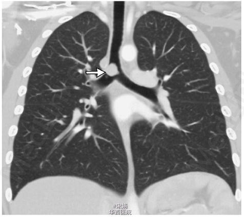 10岁小女孩,因发作性喘息,呼吸困难,进行性活动耐量下降9月就诊。既往体健。体格检查:双肺呼气相中度哮鸣音。初步诊断为哮喘,予以常规吸入支气管舒张剂、糖皮质激素,孟鲁斯特和口服糖皮质激素等治疗。病人自诉病情缓解,但上述症状仍持续存在。进一步评估患者肺功能,发现其存在呼气相梗阻,后行纤支镜发现一血管团几乎完全阻塞(大于90%)远端支气管,CT血管造影显示此肿物未侵出气管。内镜下激光切除肿物,病检结果为炎性细胞增生形成的炎性假瘤。术后一月,患者喘息、呼吸困难等症状完全消失,肺功能试验正常。尽管炎性假瘤很少造成哮喘样的喘息,不过当一线治疗没有反应的时候,就提示我们要进行进一步检查了。