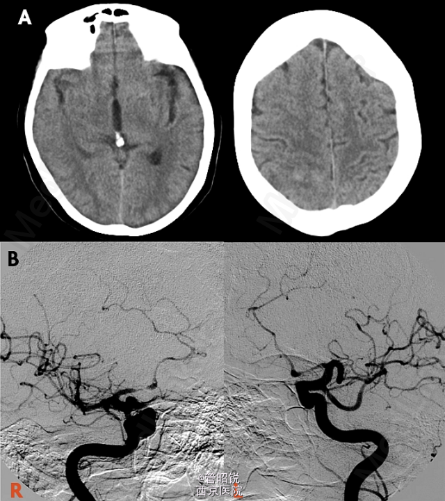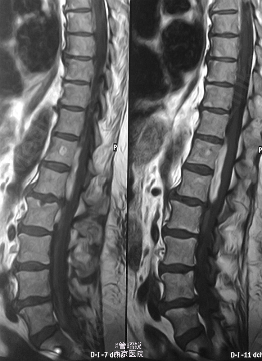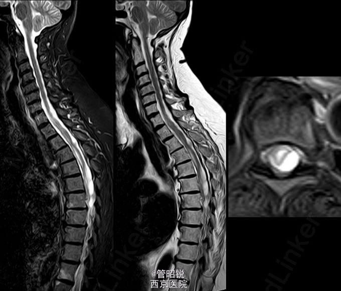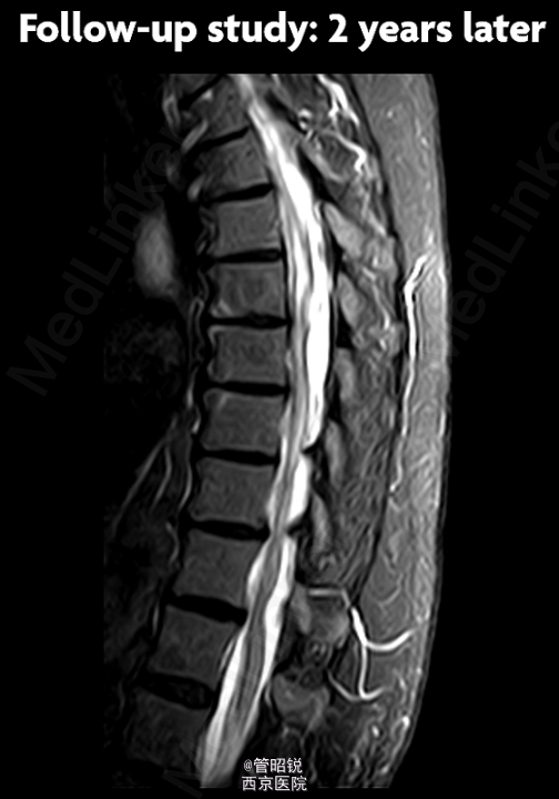 患者,男,71岁,急性头痛和腰痛。 慢性脊髓囊性蛛网膜炎是蛛网膜下腔出血的罕见并发症。此并发症被认为是由于溶血导致的蛛网 膜炎性反应,导致其纤维化和脊膜的继发性增厚,包括硬脑膜。纤维可形成囊腔包裹脑脊液,从而压迫脊髓,引起脊髓病和脊髓空洞积水征。一般保守治疗或者手术 CT显示轻微的脑室内出血,另外,在部分脑裂出可见模糊的高密度影,提示蛛网膜下腔出血。DSA双侧大脑前动脉狭窄。T1WI显示胸腰段脊髓腔内出血,定位在蛛网膜下。随访2年后,显示蛛网膜下的腔隙在脊髓表面形成扇贝样改变。随访3年腔隙仍然存在,以致脊髓表面继发性畸形。(来源于AJNR)