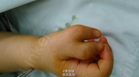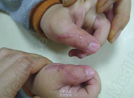 患者女,1岁,双侧蟹钳指,家长要求都行融合术。附图附上术后5个月回来随访。右拇稍有侧弯,两拇均活动好,但瘢痕还是较明显,开始用抗瘢痕药。随着瘢痕变白变软,肿胀也会进一步消退,外观会更好,我会继续随访。