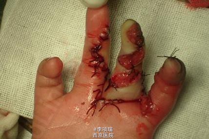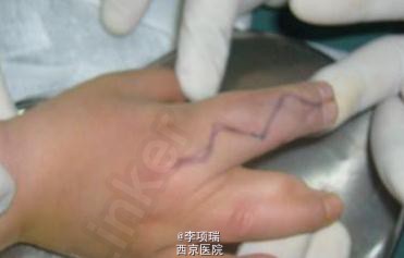 患者女,7月,右手并指多指畸形,行畸形矫治术。详细手术步骤见附图。
