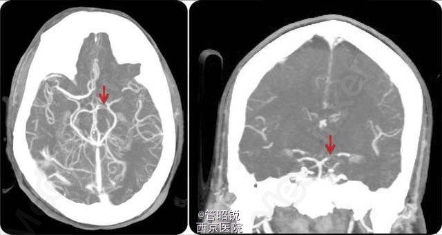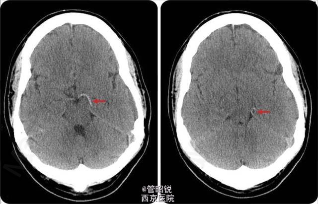 患者男性,38 岁,突发右侧肢体偏瘫、偏身感觉障碍及偏盲。头颅 CT 显示左侧大脑后动脉高密度征 (Hyperdense posterior cerebral artery sign,HPCAS)(见图 1)。CTA 显示左侧大脑后动脉闭塞(见图 2)。MRI 显示左侧大脑后动脉梗塞。经食管超声心动图检查可见一房间隔瘤和卵圆孔未闭。 患者予抗血小板聚集治疗。HPCAS 一直被认为是大脑后动脉区域急性梗塞的标志性征象。急性卒中后行头颅 CT 识别 HPCAS 有助于大脑后动脉分支梗塞的诊断与治疗。Neurology 杂志