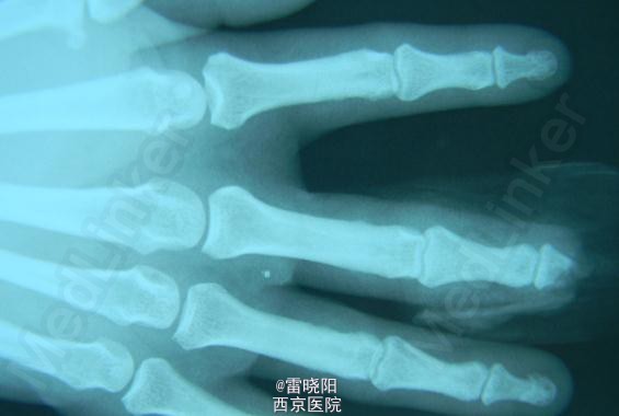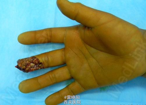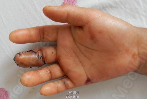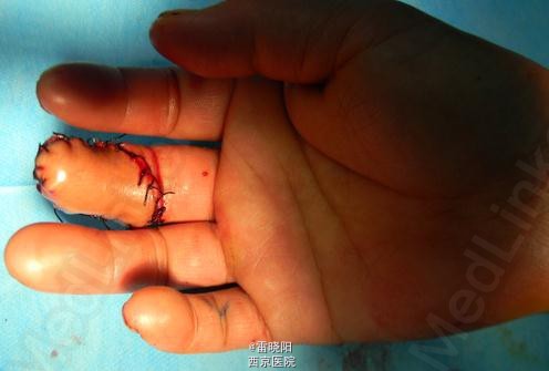 患者女性,45岁,机器绞伤右手中指1天。远节指体大部分缺失。行第三掌背皮瓣修复。