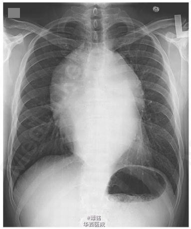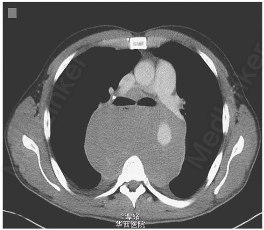 30岁男性,胸闷气紧、呼吸困难、吞咽困难、吞咽痛2月,体重减轻14kg。3年前查出I期睾丸精原细胞瘤,行睾丸切除术。此次胸片、CT显示后纵膈19*15*8cm的大肿物(图1,2),侵及邻近结构和降主动脉。hcG 4mIU/ml,LDH 1400/L,活检符合精原细胞瘤改变。采用博来霉素、依托泊苷、顺铂方案行3周期化疗,症状持续改善(随访三月,图3),见肿物逐渐缩小。10月后症状完全改善,后每4月长期随访。